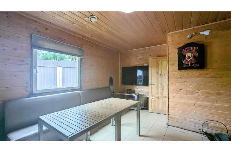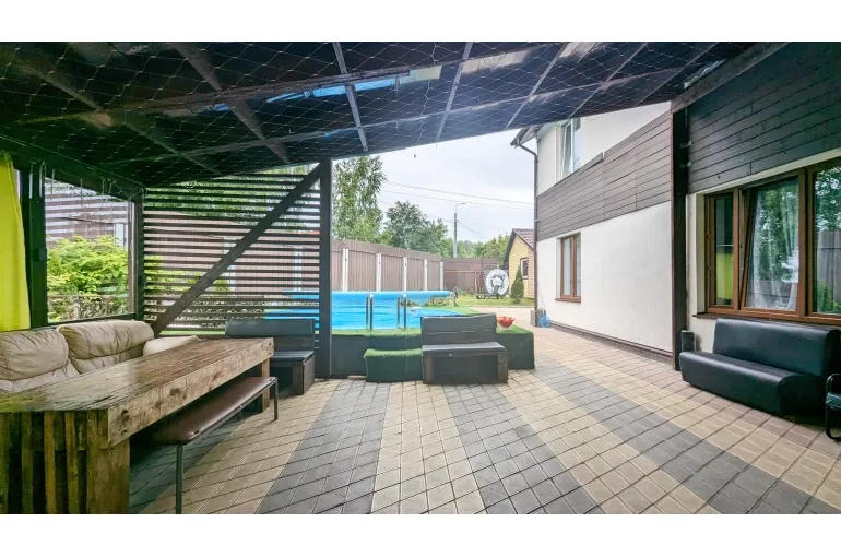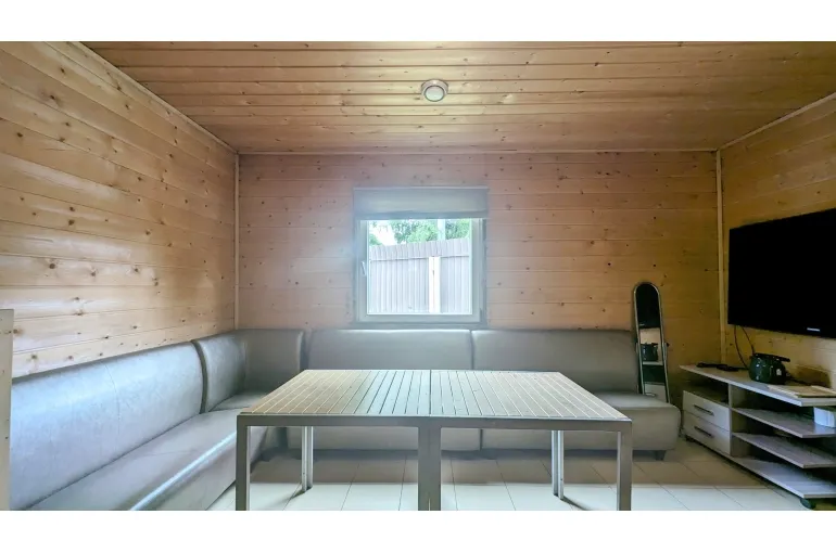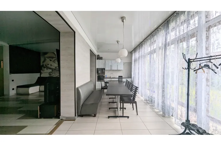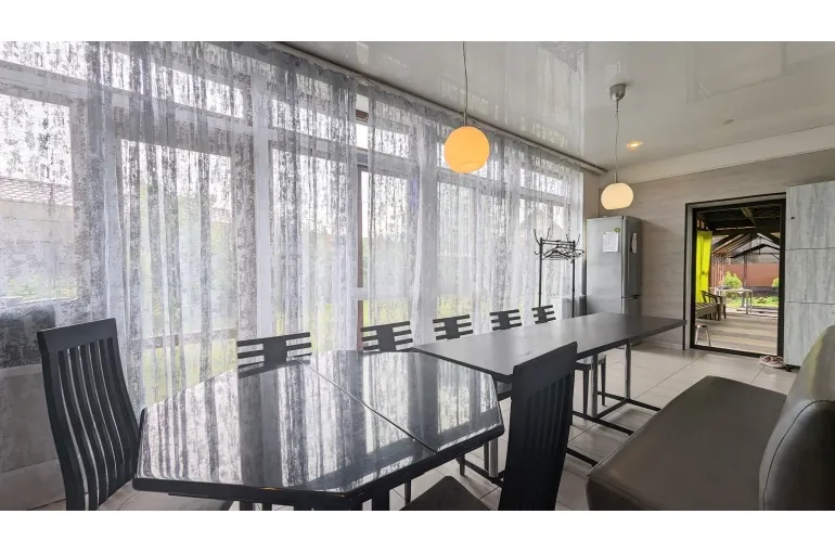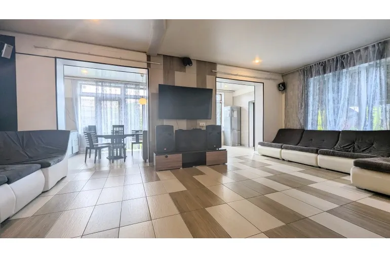 Коттедж, дом с большим бассейном .(ДОМ - КАРАОКЕ для вечеринок и диско с уютной большой верандой навесом. Профессиональная сценическая акустика, светомузыка идеально для корпоративов, дней рождения и выездных свадеб и просто для спокойного семейного отдыха. архитектурный свет и ландшафт территории, большая парковка, : на первом этаже большая гостиная объединенная с кухней-столовой. Отдельная спальня. Также санузел, и гардеробная.