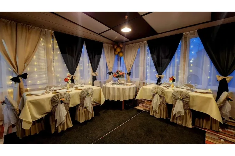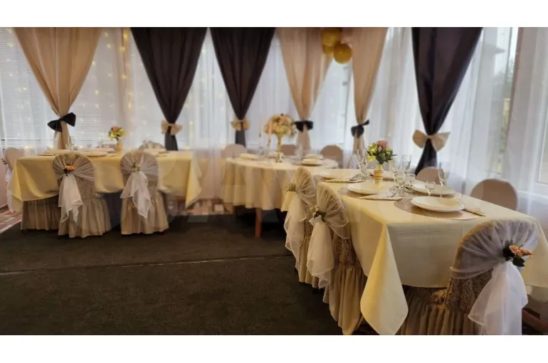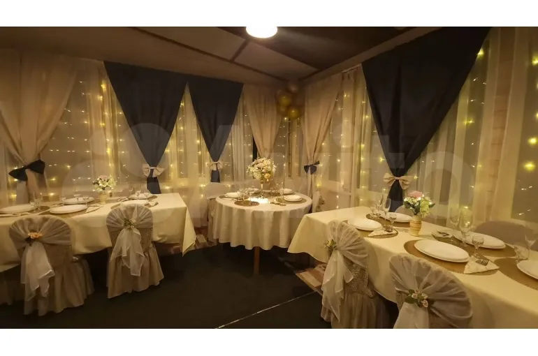 — в банкетном зале один большой круглый стол и 2 прямоугольных стола, посадочных мест 14