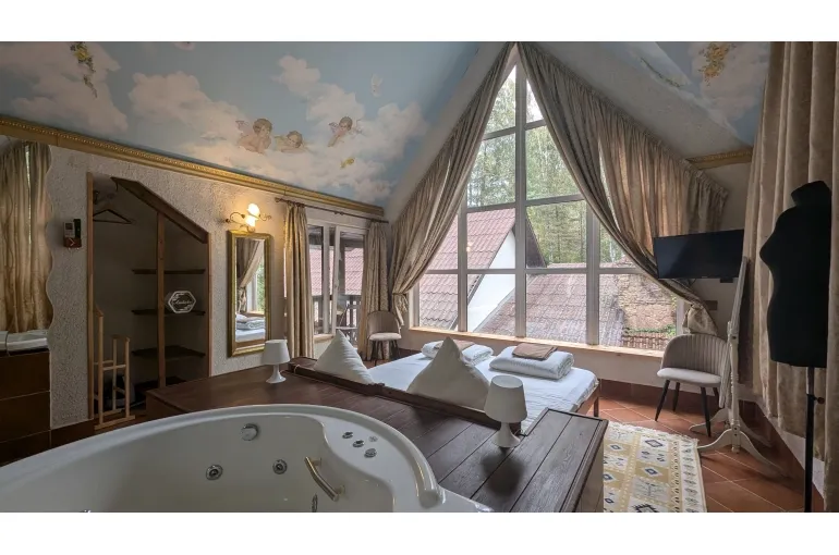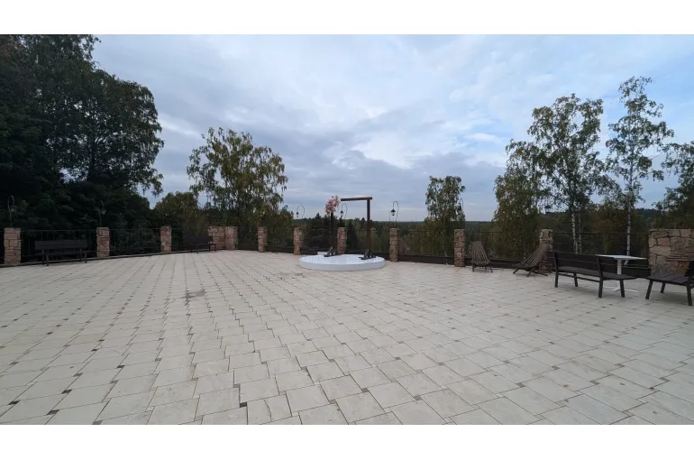 Имеются все удобства для отдыха : оборудованная кухня, сауна, теплый бассейн, бильярдная, большой общий зал. Зона для барбекю, отдельная большая парковка. Свой выход к озеру с пирсом и прилегающая территория обеспечат Вам замечательные прогулки на природе.