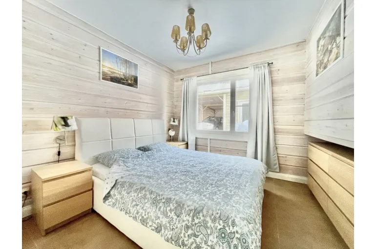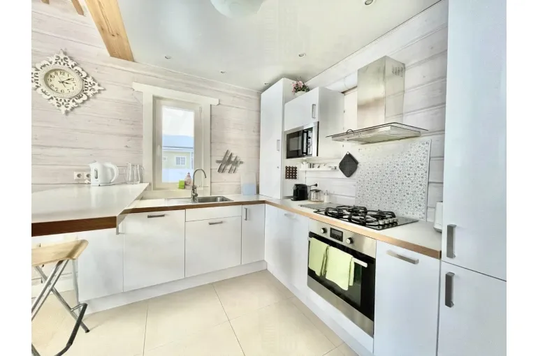 на 1 этаже - прихожая, кухня (газовая плита, духовка, микроволновая печь, чайник, тостер, кофе-машина, посуда для приготовления и сервировки на 10 персон), столовая, гостиная с камином, кондиционер, 1 спальня с двуспальной кроватью, 1 спальня с 2 двухъярусными кроватями, санузел с душем, сауна, большая терраса.